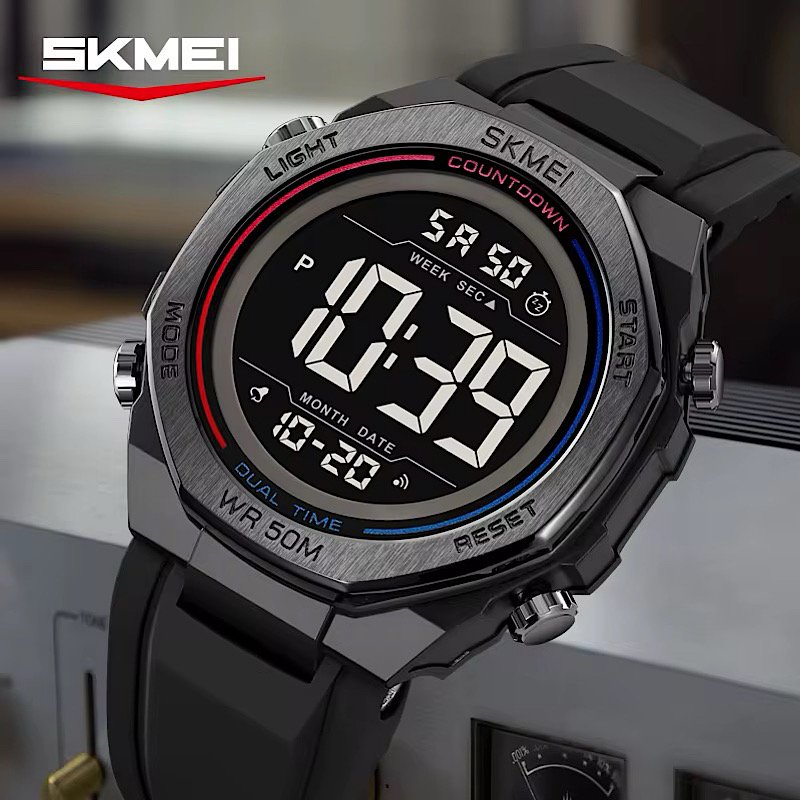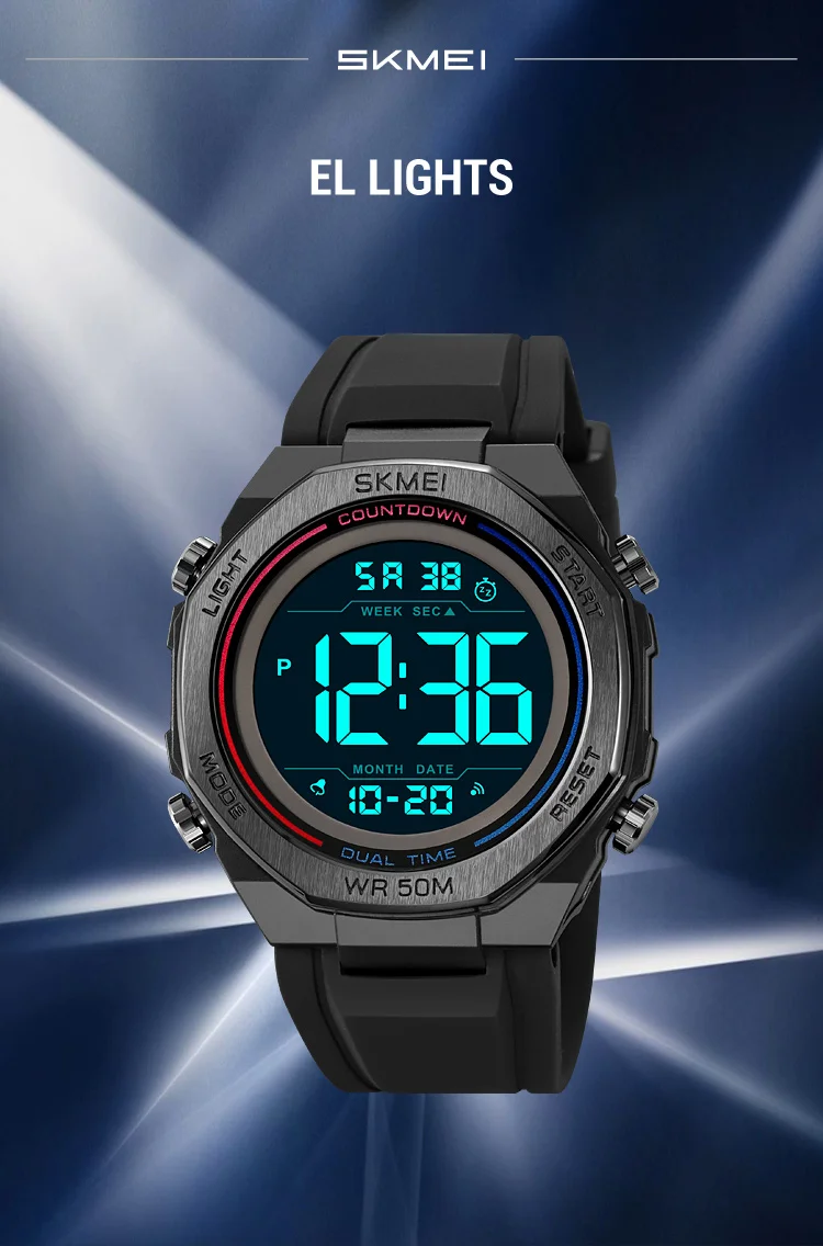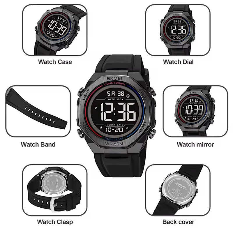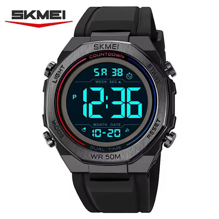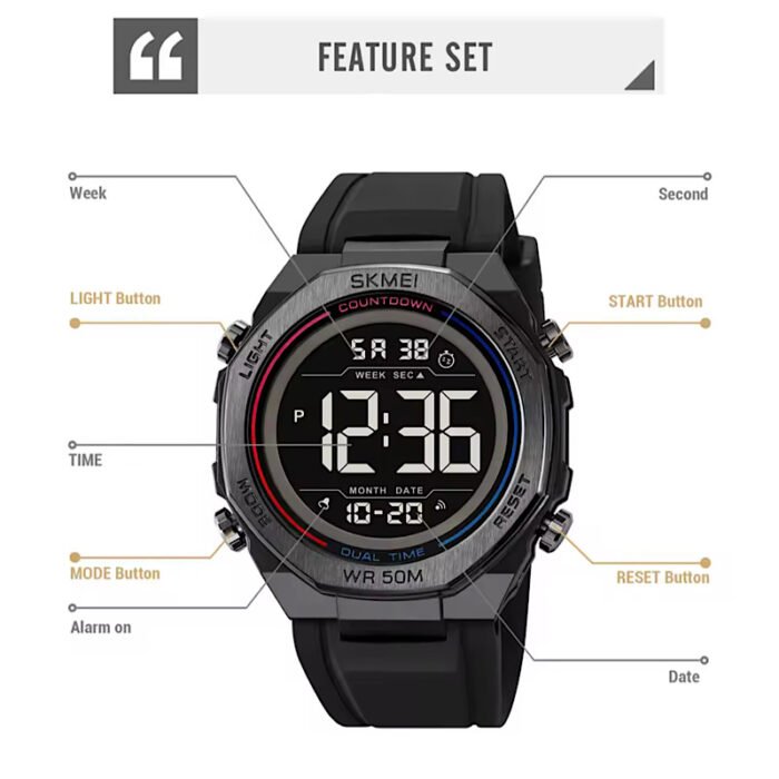SKMEI 50M Waterproof Digital classic wrist watch with a complete calendar display, Alarm, a stopwatch and LED light for night vision . Order one today and have it delivered right at your doorstep.