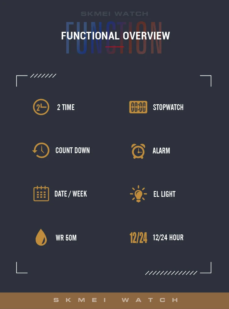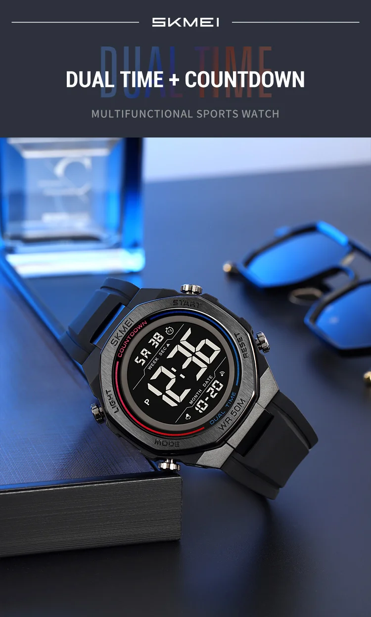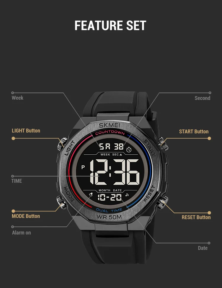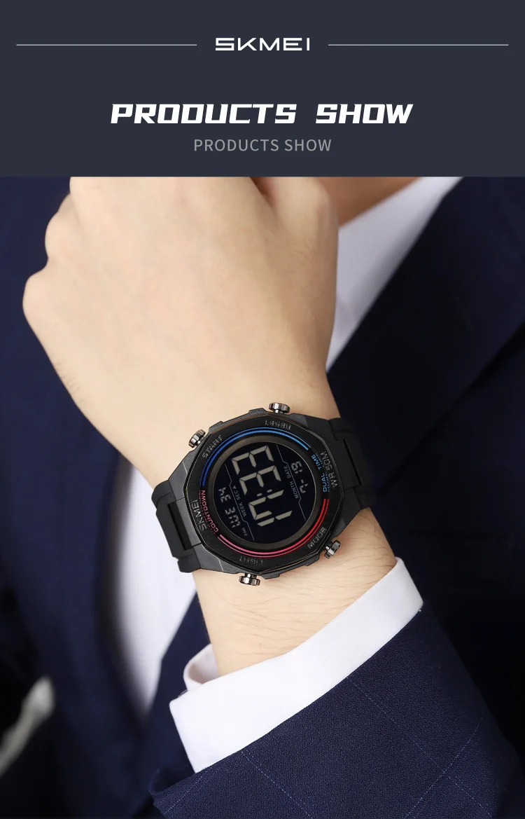SKMEI 50M Waterproof Digital classic wrist watch with a complete calendar display, Alarm, a stopwatch and LED light for night vision . Order one today and have it delivered right at your doorstep.