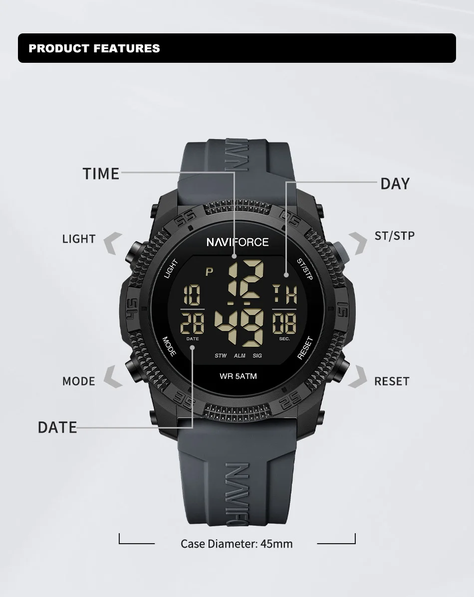 - Functional features; Alarm, stopwatch, complete calendar display and LED light for night vision.