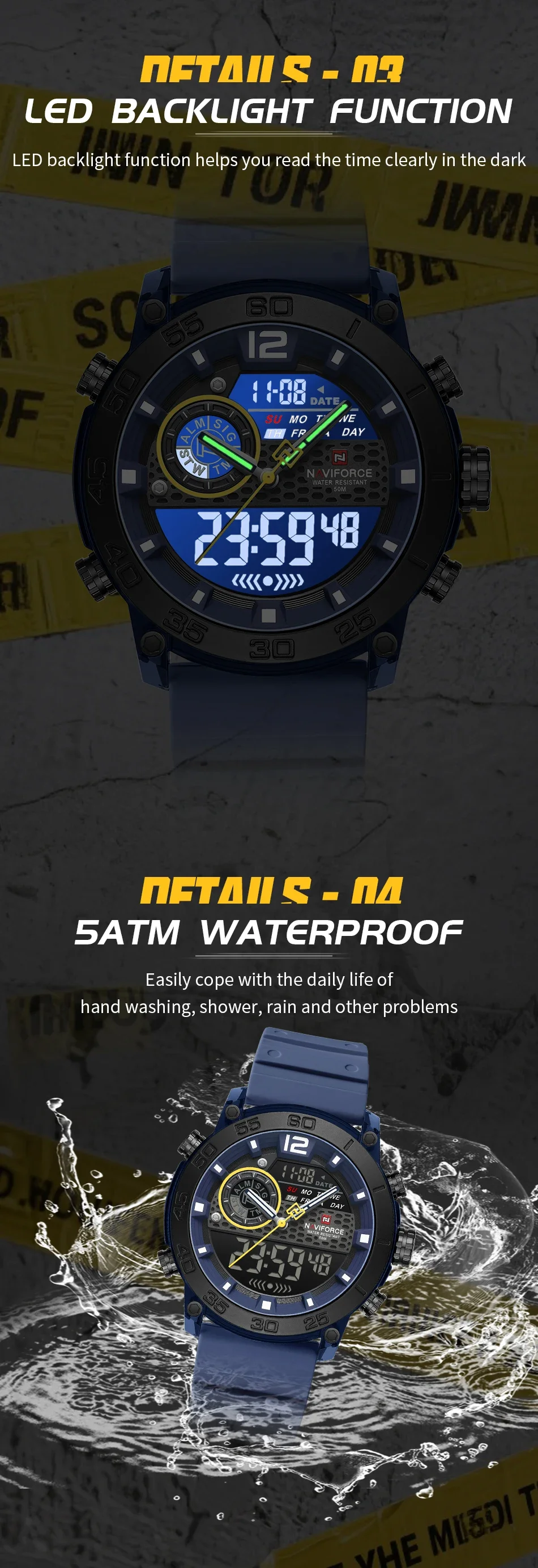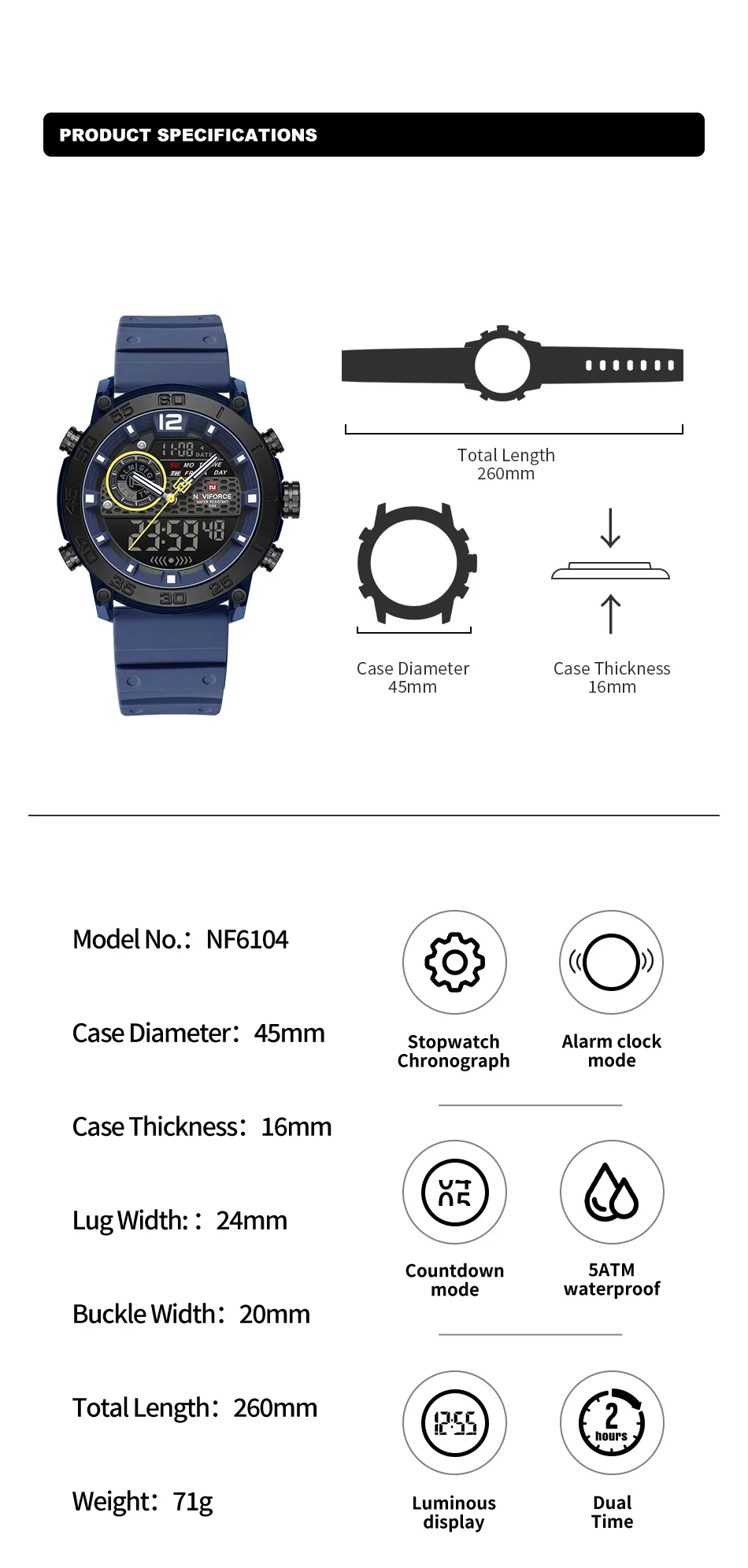 Naviforce  Men’s Dual time 5ATM water resistant wrist watch with alarm, stopwatch and a complete calendar is a must have fashion accessory .Order yours today and have it delivered to your doorstep.